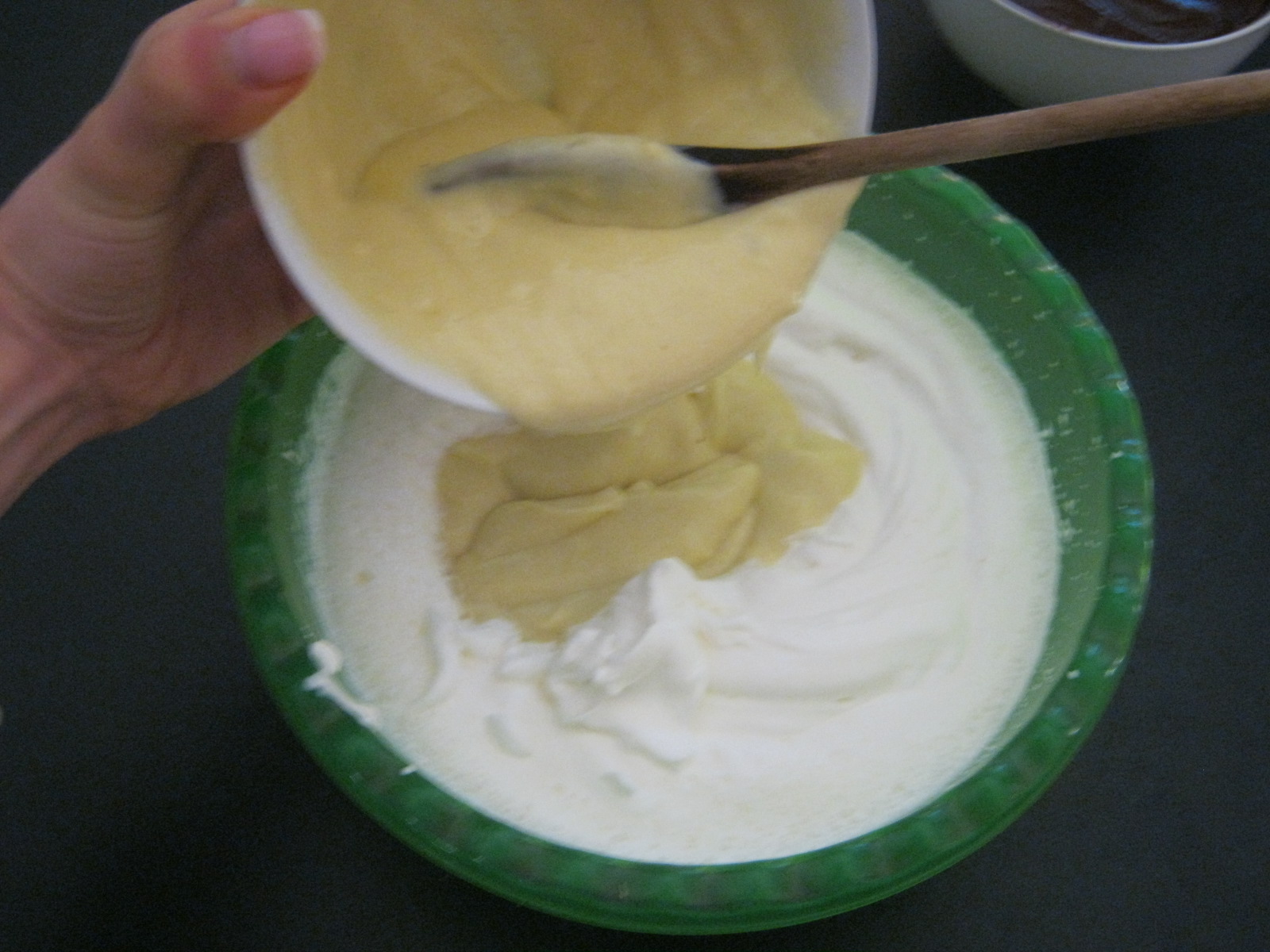 7. montiamo la panna per dolcie la incorporiamo delicatamente, servendoci di una spatola, alla crema pasticcera,